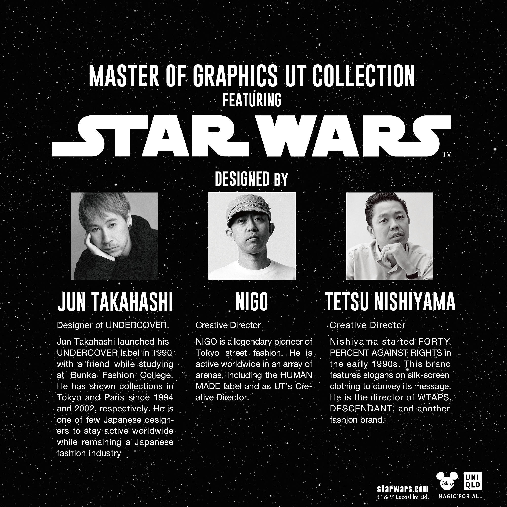 The Star Wars universe has inspired creative minds all over. Three legends of Japanese streetwear pay homage in this special UT collection. TETSU NISHIYAMA Creative Director © & ™ Lucasfilm Ltd. About UTLaunched in 2003 as a tool for expressing one’s individuality, UT (you-tee) is UNIQLO’s graphic T-shirt brand that incorporates an impressive range of unique content from pop culture including art, music, movies, manga, and a nime.